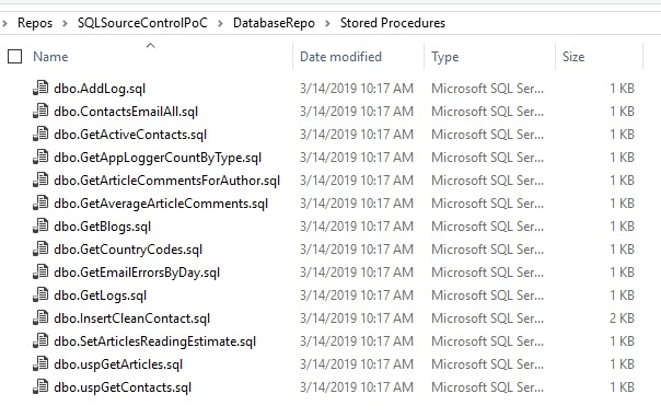 SQL Source Control has created folders for my objects, with a separate file for each object below the folder. For example, the Tables folder looks like this: