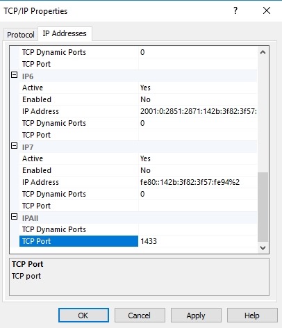 At the bottom, there’s an IPAll item. This is likely set for Dynamic ports for your named instance. Remove the 0 and enter 1433 for the TCP Port line. You should get something like this: