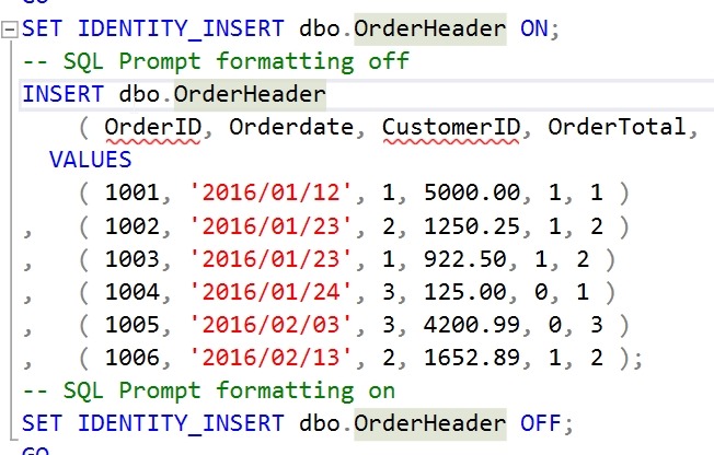 Now I can format easily without worrying my VALUES clause will get spread all over the page.