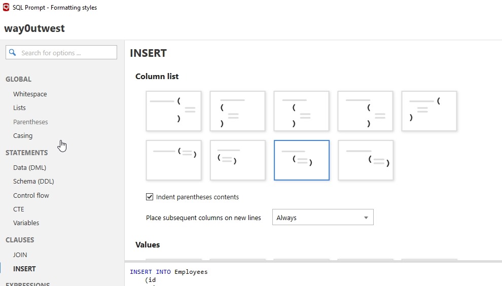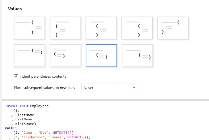 A new option for formatting called “INSERT”. This allows you to specify how you want to insert column list to appear. What’s even better, is at the bottom it says “Values”. Scroll down and you see options for separately formatting the VALUES clause, which I use all the time.