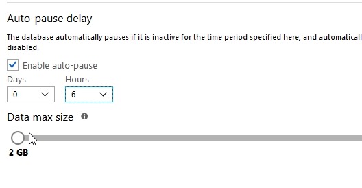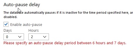 The last thing to set is the Auto-pause delay. This is the amount of inactive time that we set before the db shuts down. We don’t want this shutting down after a few seconds of inactivity, presumably because there is overhead to shutting down and restarting. I’d expect that most people would want tens of minutes or hours before stopping.