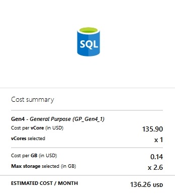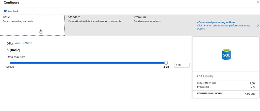 Here’s my database config and cost. For my little dev/test environment, this makes perfect sense. I’m paying $4.99 a month in virtual cost. Since I get $150/month as part of my subscription as an MVP, I can afford to put up 5 or 6 of these test databases for different things without worry.