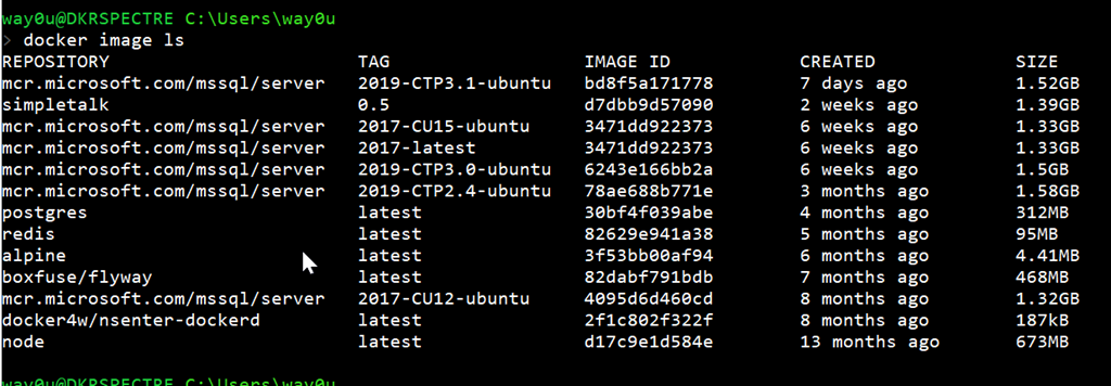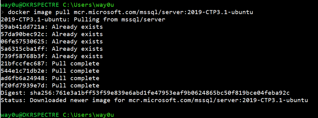 The main SQL Server 2019 image exists in a few flavors on my machine, so as you can see, I don’t even download the entire image.