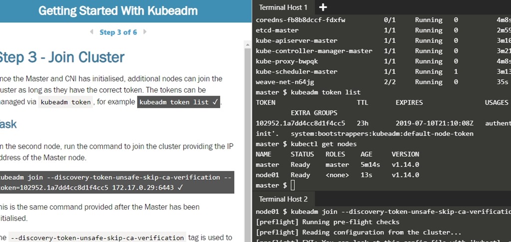 The first course gets you a cluster with minikube. The second course lets you set up a two node cluster, which is a little more interesting. After all, the idea here is that you want a whole series of machines to act as a cluster of nodes. The process to join nodes is with a token, at least here it is. There can be other authentication if you really do this.