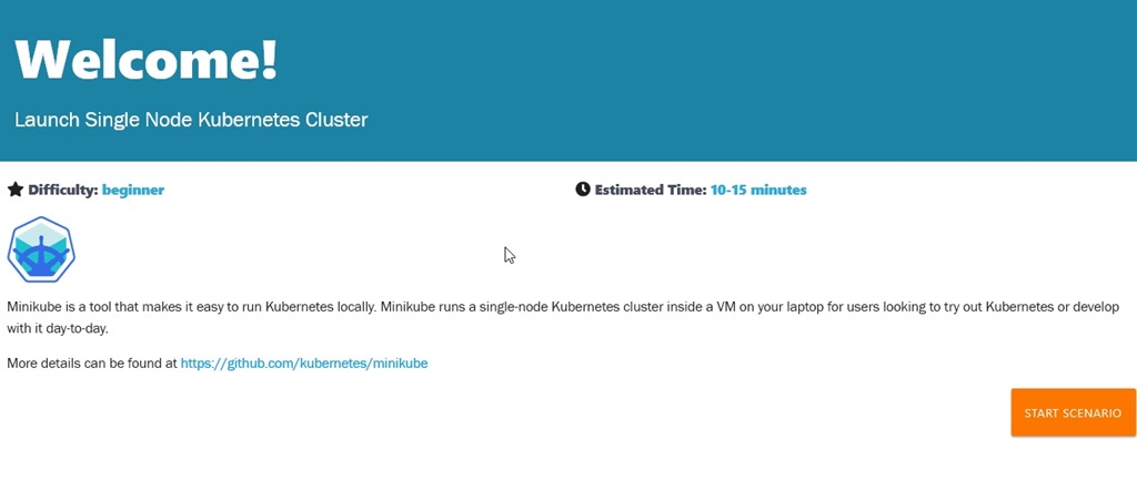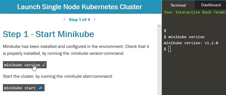 When you start the scenario, you get the course on the left and a terminal on the right. If you click a section of code (like minicube version), it will run this in the terminal.