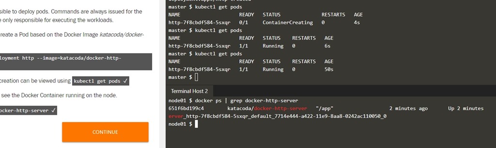 I did run the “get nodes” or “get pods” a few times, seeing the different messages as new containers/pods were being created, noting the delays as things are deployed. I also learned that the containers distributed on the nodes are shown under the Docker command CLI. That is interesting and unexpected to me, though it shouldn’t have been.