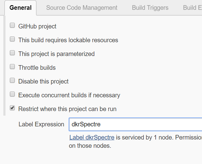 I do want to restrict which agent will run this, since I have a master agent in the Jenkins container. That one can’t see my SQL Server (and doesn’t have tools), so I’ll restrict this to the local agent on my machine.