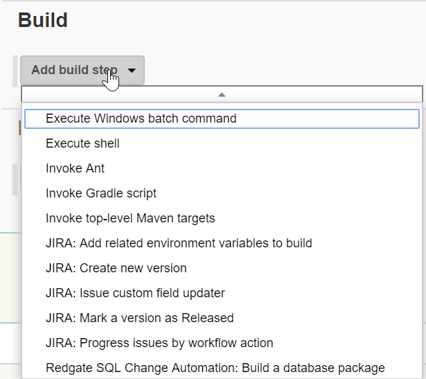 When I scroll down to the Build area, I need to add a step. CI is just a step engine to assemble your software, and in this case, I see my Redgate SQL Change Automation plugin.