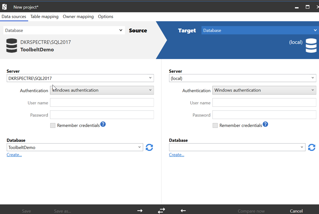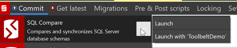 This feature, however, is designed to fit into our DevOps solution, bringing the tools together for those people that are working inside of the Redgate process. In this process, I can quickly launch many of the tools with context. When I click the “Launch with ‘ToolbeltDemo’, I see this when Compare opens.