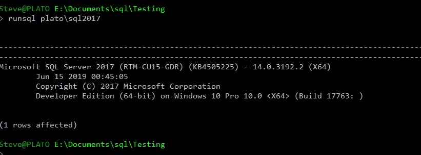 The other is my batch file, which I’ll name runsql.cmd. In this file, I’ll do a few things. First, suppress the code with this:
