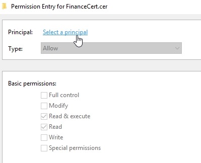 What I needed to do here was add permissions for another service account. Clicking Add lets me select a principal.