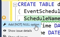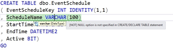 This looks fine, and it works. However, it’s a SQL code smell, and it’s something that you should avoid. The problem with this code, is that I haven’t specified the nullability setting for the columns. I am assuming a default for my database, which has worked for me, but as I work with a more diverse set of customers, I know this isn’t a good practice.