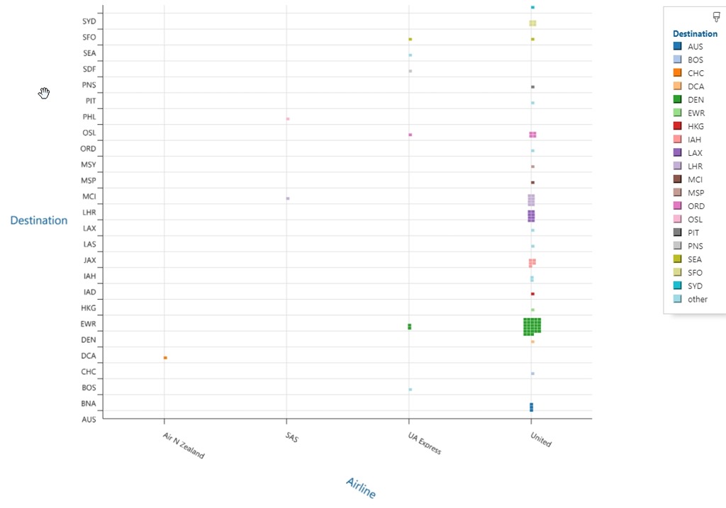 I was experimenting with visualizations the other day, and started playing with SandDance, a tool from Microsoft that you can use in Power BI or Azure Data Studio. I’ll write more, but I loaded up a quick look at the last couple years of travel for me. Here are airlines v destinations: