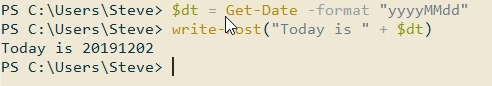 $dt = Get-Date –format “yyyyMMdd” write-host(“Today is “ + $dt)