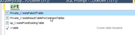 Now, let’s use this. I’ll save this and close the options. Then in a new query window, I’ll type my snippet beginning as “crt”. I see this: