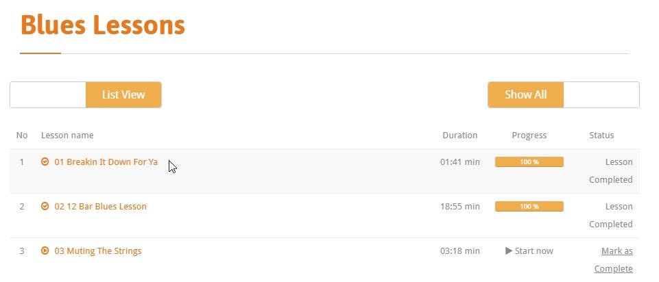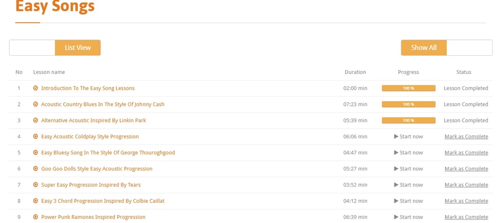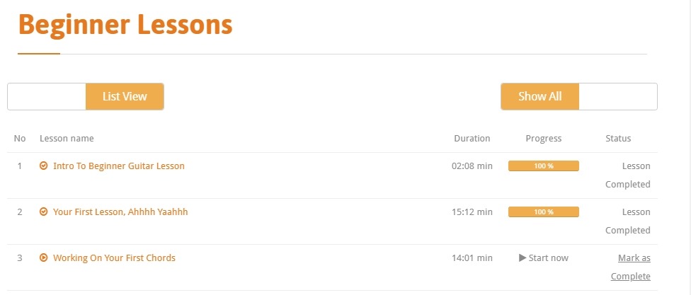 Next, I started the beginner course. It’s below me, I’m more of a hack, advanced beginner, but I decided to see if I missed anything over the years. This basic, Em, Asus2 chords, adding in a D and working strumming, which is good to practice. I did two of these.