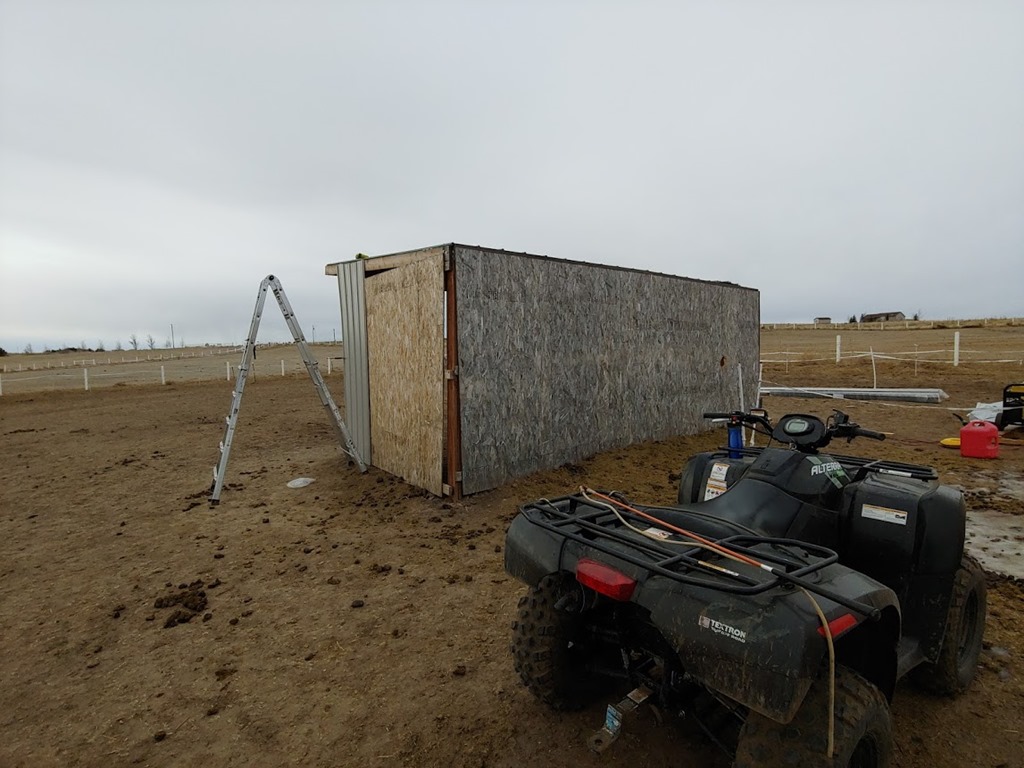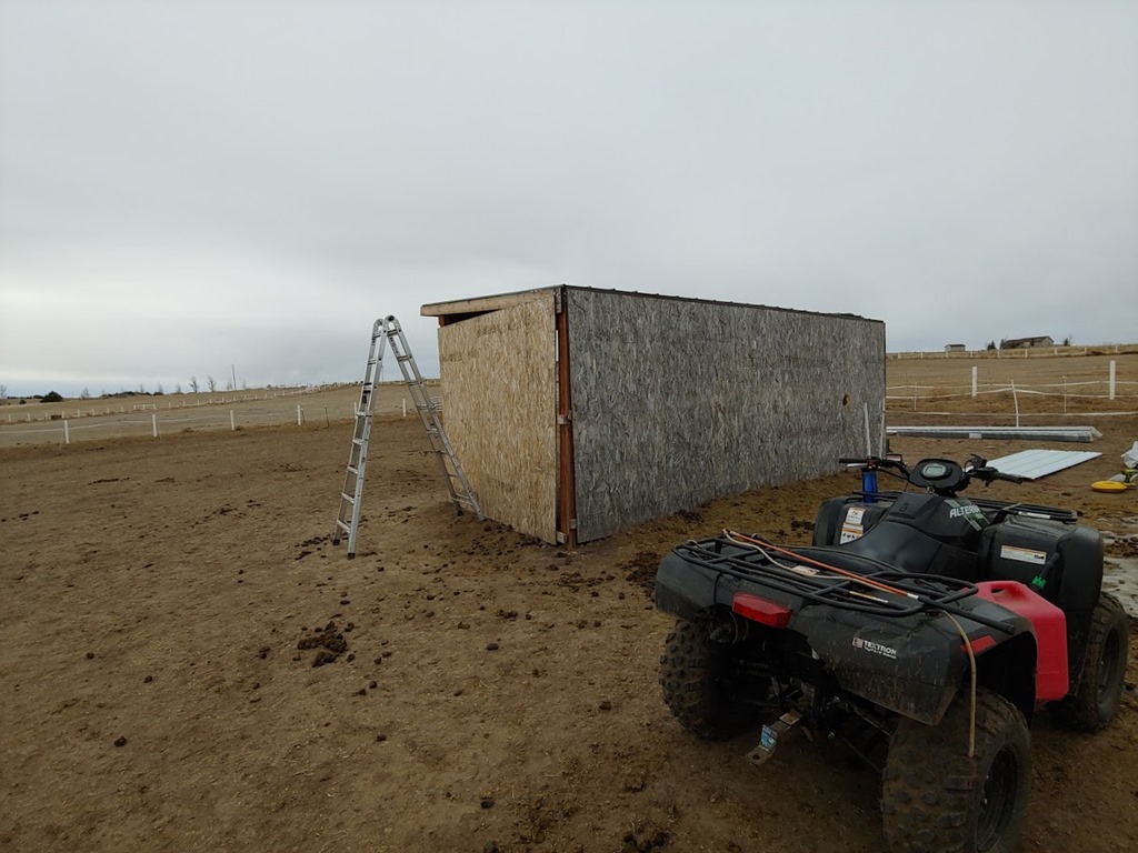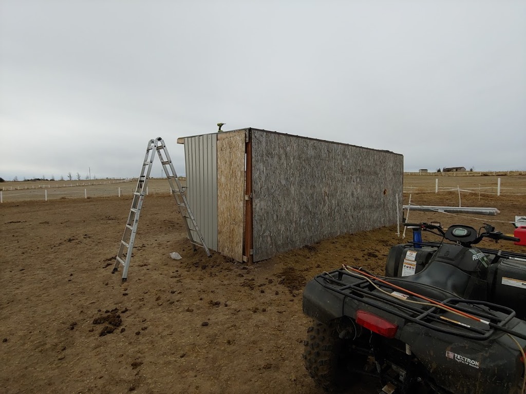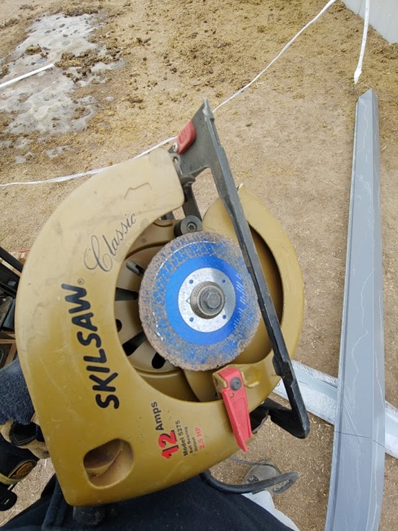 Just how I left things last summer. Well, minus the tools, ATV, etc. There was a touch of wind, 5mph or so, and I was slightly worried, but I decided to get going. I measured the first panel, marked it, and went to cut it.