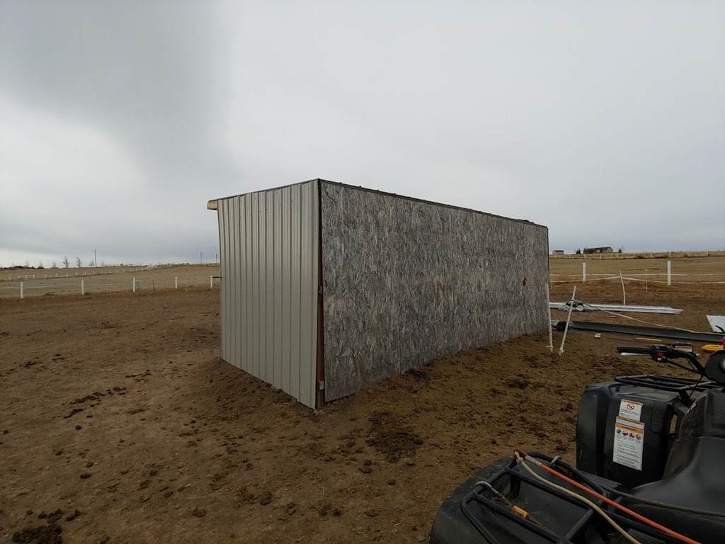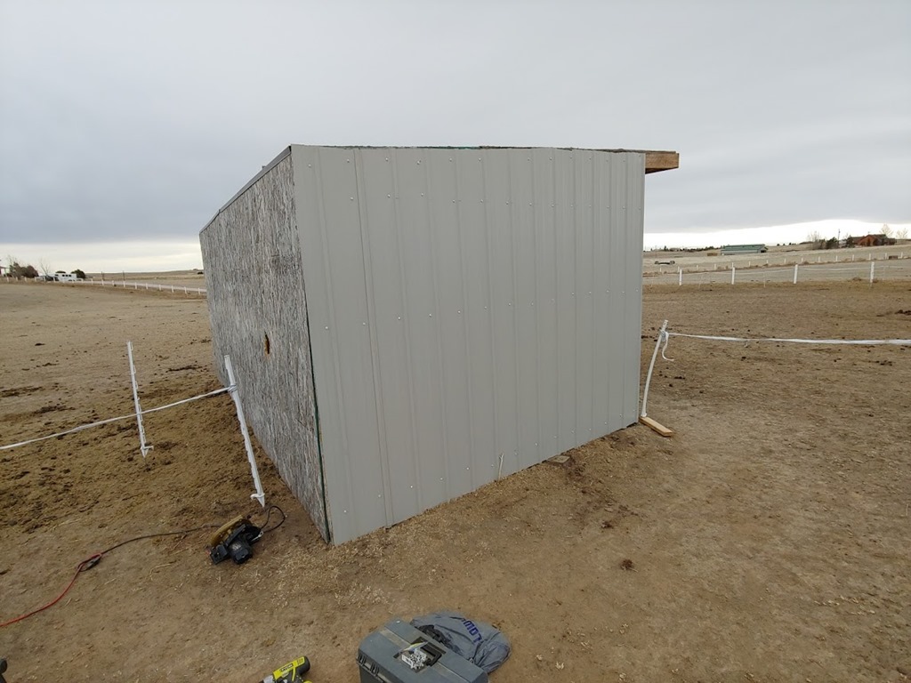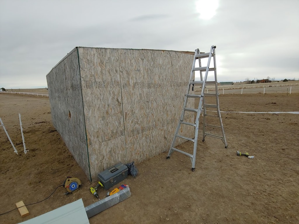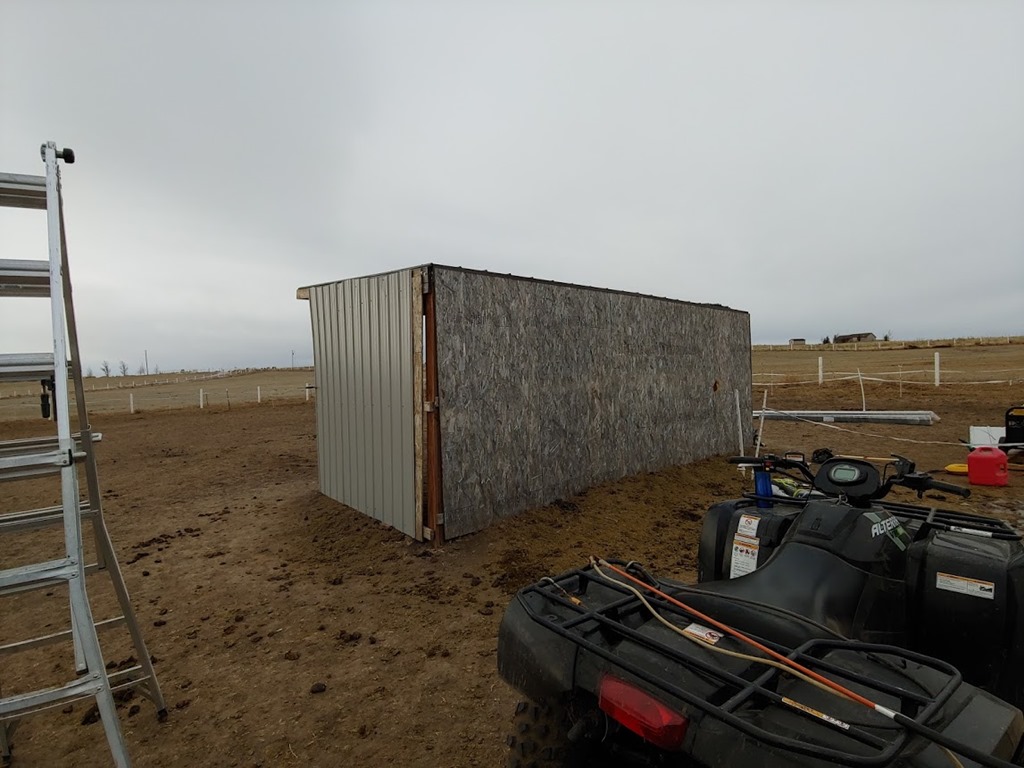 That last cut is tough, since it’s a 10ft shed, and I need to get 1 foot out of a 3 foot panel. Cutting these by myself is hard as they are sheet metal and flimsy, with just some wood to hold it off the ground. But I got one side done.