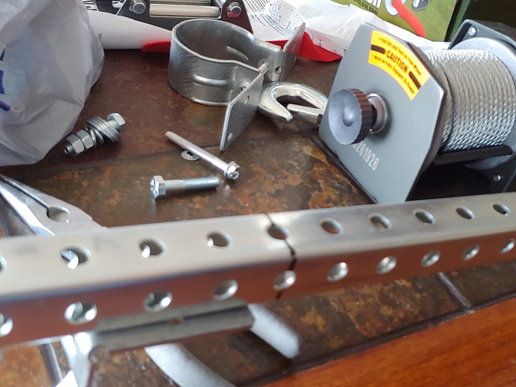 Next, the winch. I had all these parts, which I needed to bolt this to the building. In trying to work out the best way to do this, I walked out and put things up in the air and tried to visualize the best way to do this. With a small idea of what to do, I next laid things out and tried to mark up where to cut.