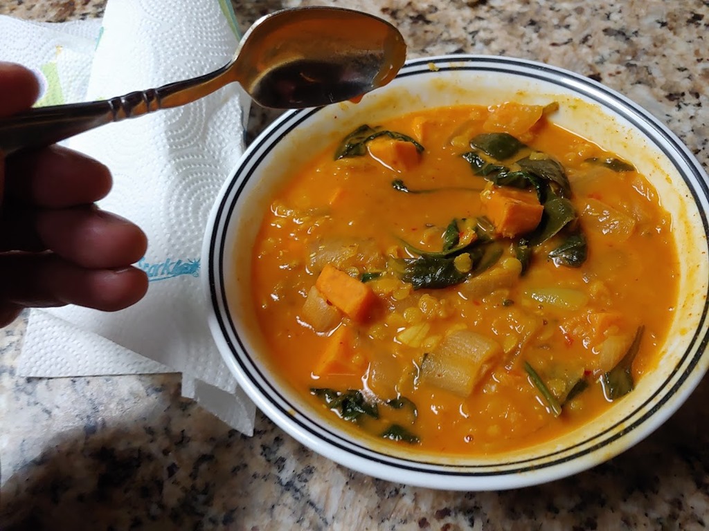 Then it’s off to yoga, the store for battery terminals, and back home to eat. I made Red Curry Lentils with Sweet Potatoes and Spinach. It’s good. Others have eaten, so I finish and then relax with my wife for a bit. It’s been a long day for her, but a relaxing one for me.
