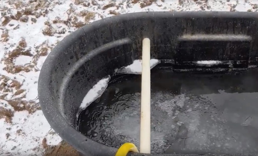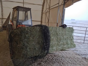 No snow, as we went out early (815), and we were trying to beat it. While my wife got grain ready, I loaded up a bale in a net. These slow feeding nets work great in bad weather.
