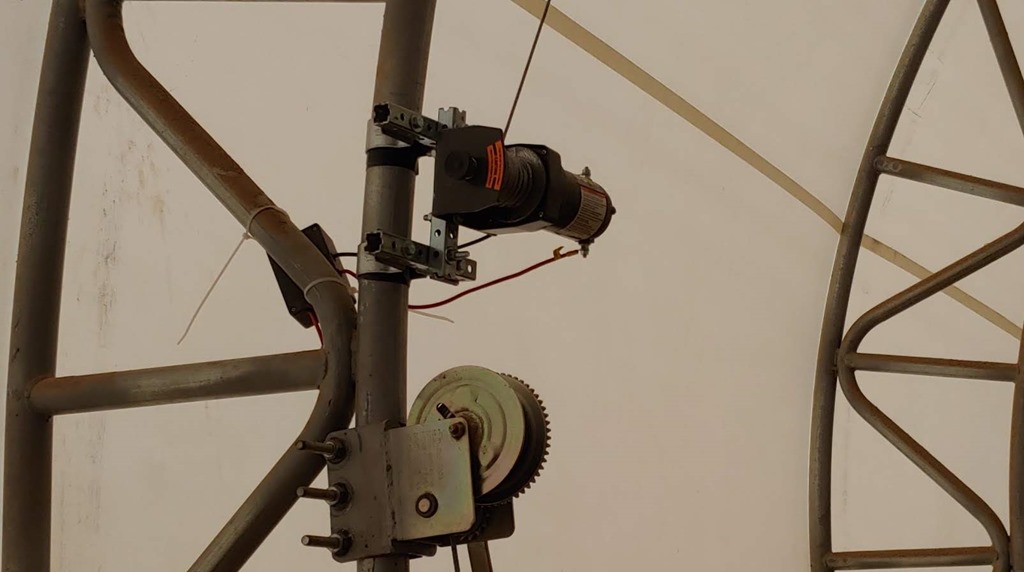 I had to engineer a way to attach this winch to the frame, which was custom metalwork for me. I then had to wire this to a battery and add a solar panel to keep it charged.