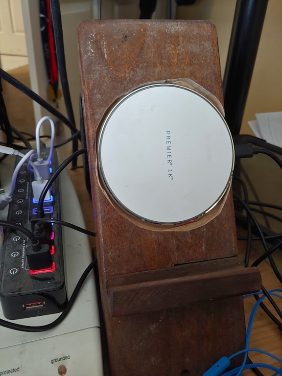 I cut two pieces of wood, got them to fit together, and stained them. I’ve dropped my phone on this for 3 or 4 years. Last year I moved to wireless charging and didn’t use this as much, but over my sabbatical I routed out a hole for a wireless charger (thanks, @United) and then plugged it in. Now, I can drop my phone here and it charges.