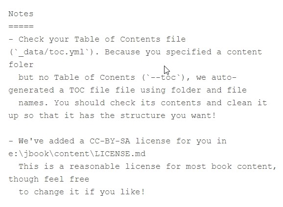 Next I ran step two, which asks for a path for your notebook, which should be an empty folder or a new folder. I entered a new folder that doesn’t exist (e:\jbook). Next, I entered a folder where I have a few random notebooks. I also added a license file, since the Jupyter Book project suggests one. Here was the folder I added: