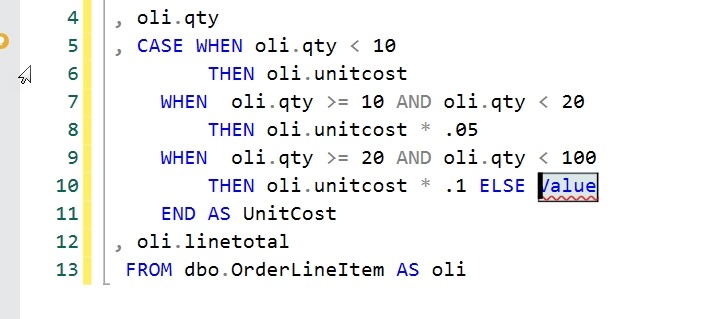 SELECT oli.OrderLineItemKey , oli.OrderID , oli.qty , CASE WHEN oli.qty < 10 THEN oli.unitcost WHEN oli.qty >= 10 AND oli.qty < 20 THEN oli.unitcost * .05 WHEN oli.qty >= 20 AND oli.qty < 100 THEN oli.unitcost * .1 END AS UnitCost , oli.linetotal FROM dbo.OrderLineItem AS oli