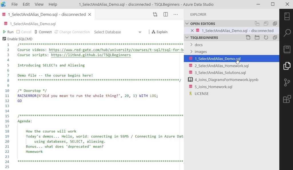 Kendra has done an interesting thing with putting her course on GitHub. That’s a great idea, though for mine, I am following articles on SQLServerCentral. Having a good outline and resources for students is a good idea, and everyone ought to be able to use a VCS, including GitHub, so I like putting pages here and code in a repo.