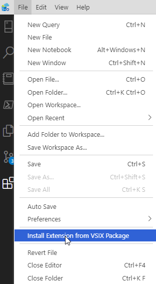 Now, from Azure Data Studio, you have a few choices. The File menu includes an Install Extension from VSIX option.
