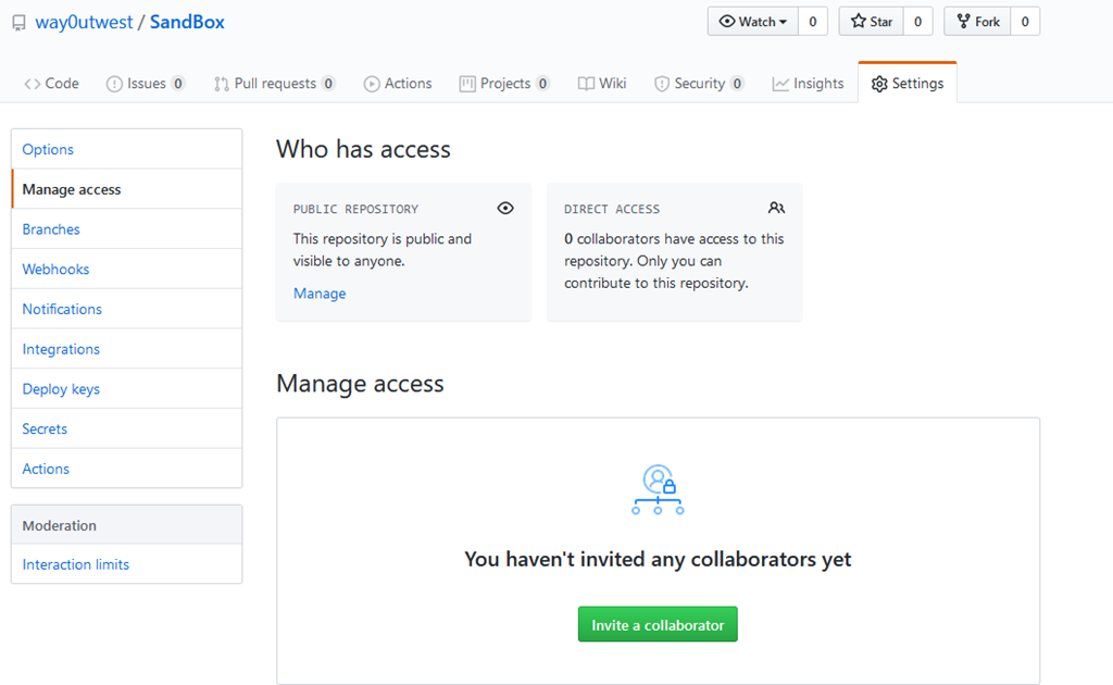 However, the docs talk about access, so I decided to check the “Manage Access” item on the left. I see options, and since this is a public repo, I see the “Manage” link.