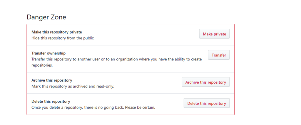 The help docs say to find the Danger Zone for your repo. I didn’t see this as an item under Settings. Instead, I see this.