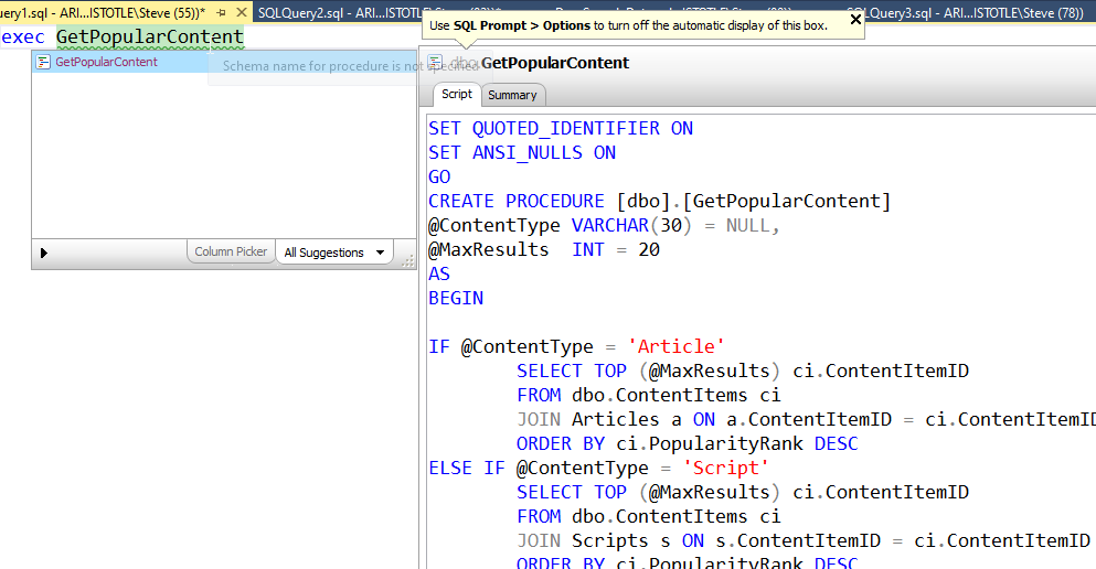 I saw a question recently about getting the code in a stored procedure. I’ve become dependent on SQL Prompt, which gives me a nice preview of code when I see a proc: