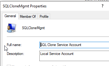 Once this is done, I’m going to start with the service account. I use SQLCloneMgmt for my service account name. I’ll create this on the local system. You can use a domain account as well, and the setup will assign the rights needed for running a service.