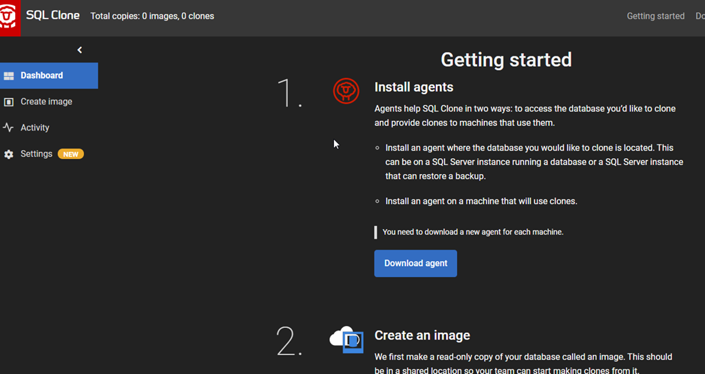 This is the welcome screen for the Dashboard. Since this is a new install, there is not information here. Click “Get Started” and you move to the flow that is used for SQL Clone.