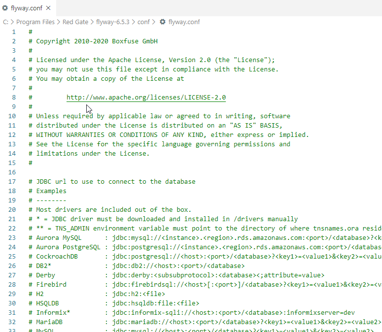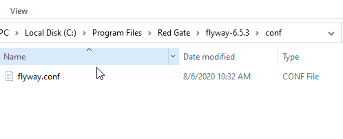 I looked in the conf folder under my Flyway install. Under here is the flyway.conf file, which is a key-value configuration file. It reminds me of the old Windows 3.1 .ini files.