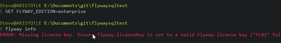 I wasn’t sure if flyway.licenseKey is a file or a setting. I looked around a bit, and on the download and install page, I found an item doe the Configuration. This mentions that the first place Flyway looks is the install folder/conf/flyway.conf. Aha!