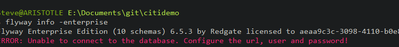 Once done, I can test this with “flyway info” at a command prompt.