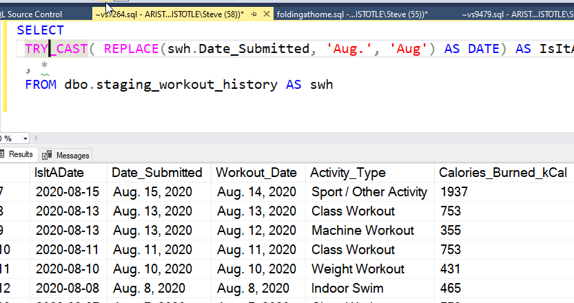 Hmmm, there are other issues. I could remove my CAST and scroll through, but there’s an easier way. I’ll use TRY_CAST() instead. If I restructure my query, I can run it to completion.