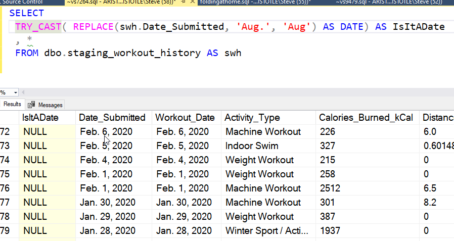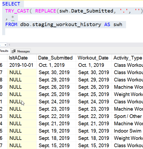 Now I can scroll through. I could also add a test for getting NULL from TRY_CAST to find the problematic dates. Here’s where I see more problems.