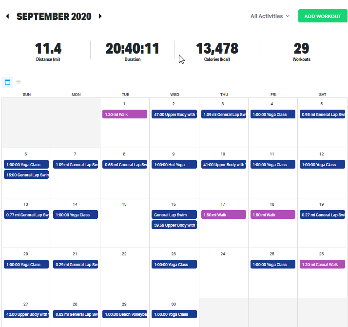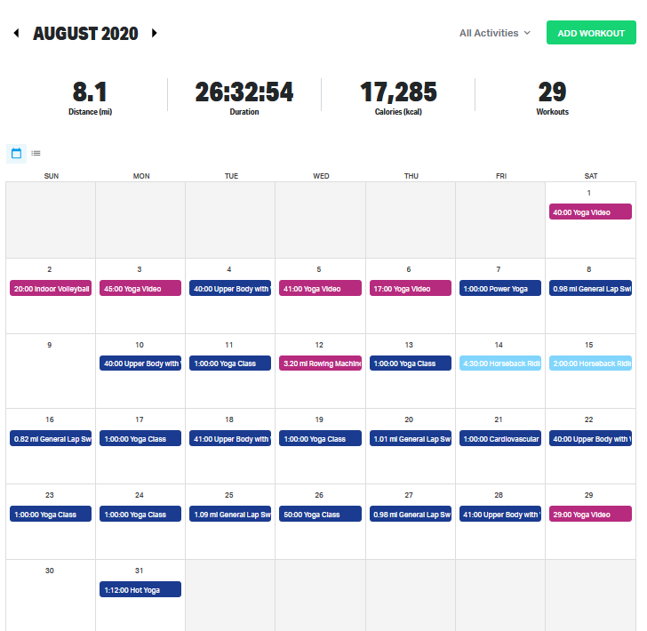 One of those things that I often do is try to take care of my body with regular exercise. I take it for granted that I’ll go to a few yoga classes, practice on my own, life weights, and more. I don’t miss a lot of days, as you can see from my August