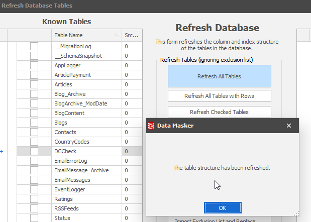 Once I pick that one, I have a bunch of more options, which gets confusing, but I can click the “refresh all tables” at the top, leaving everything alone. Once that’s done, I get a note.