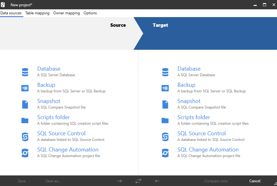 If I start SQL Compare by clicking a project, it opens and my settings are there. When I start SQL Compare, it brings up the New Project dialog, shown here: