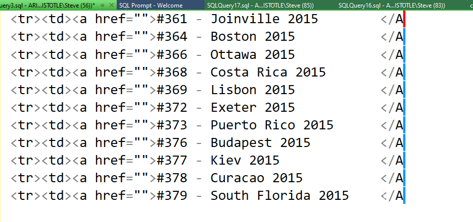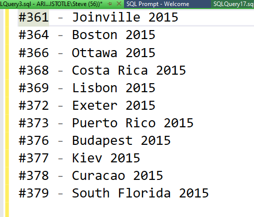 In a hurry, I copied and pasted his list of events into SSMS in a new Query Window. One of the reasons I do this is that the cross line editing is superior (IMHO) to VS and VSCode. I’ll repeat the process with just a few lines here, but keep in mind I had like 800. This is a useful text trick as well for some data changing.