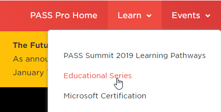 This take you to the PASS Pro site. Here, you need to click “Learn” and then pick the item you want. I was more concerned with the current videos than older ones, so I chose the Educational Series.