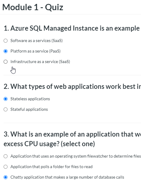 The caveats here are that there are assessments, and you cannot get past them until you go through them. Take some guesses, as you have a few chances, but note your answers. Maybe you can answer well enough to get past them. If not, here were my quick guesses on module 1 for cloud: