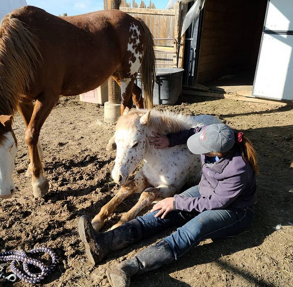 Later, after feeding some horses, we found the foal slightly trapped under the fence. My wife pulled her out, but she lay there for a few minutes and I caught them together.