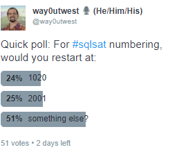 I started a poll today on the naming for future SQL Saturdays. You can answer here: https://twitter.com/way0utwest/status/1380524526455390209