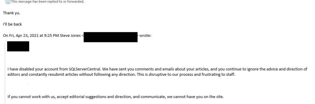A few weeks later, I got the same articles submitted. Comments removed, and as far as I can tell, the original text I’d rejected. Title changed back. I sent an email asking them to rewrite based on comments and not to resubmit them.